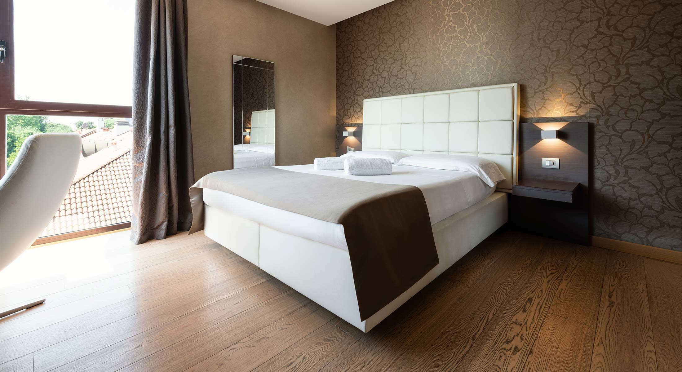 Room with double bed or two twin beds, furnished with modern and elegant style, equipped with shower with color therapy and treatment of every amenity needed to ensure a pleasant and relaxing.